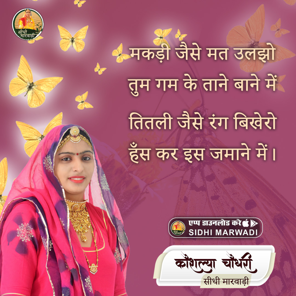 рдордХреЬреА рдЬреИрд╕реЗ рдордд рдЙрд▓рдЭреЛ рддреБрдо рдЧрдо рдХреЗ рддрд╛рдиреЗ рдмрд╛рдиреЗ рдореЗрдВ рддрд┐рддрд▓реА рдЬреИрд╕реЗ рд░рдВрдЧ рдмрд┐рдЦреЗрд░реЛ рд╣рдБрд╕ рдХрд░ рдЗрд╕ рдЬрдорд╛рдиреЗ рдореЗрдВред