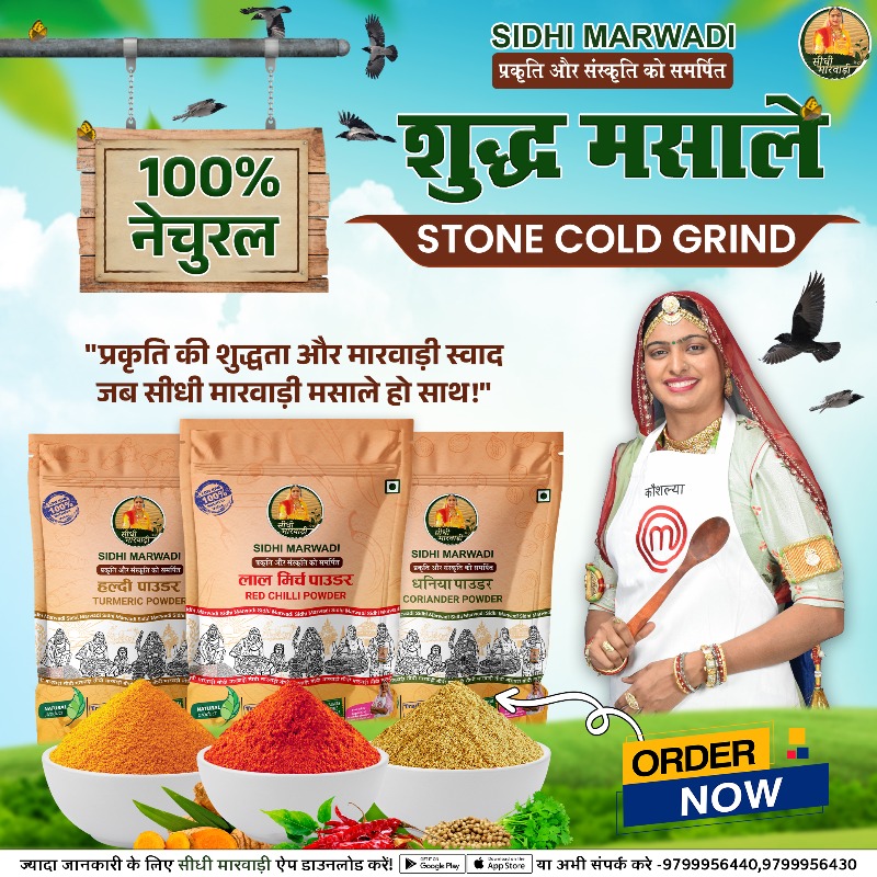 शुद्धता मतलब सीधी मारवाड़ी...! स्वाद और स्वास्थ्य को ध्यान में रखते हुए 100% शुद्ध मसाले Low RPM पर पारंपरिक प्रक्रिया द्वारा तैयार किए जाते है।