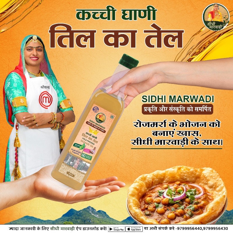 सीधी मारवाड़ी तिल का तेल पारंपरिक प्रक्रिया द्वारा प्राकृतिक गुण और पोषक तत्व सुरक्षित रहते हैं। यह तेल बिना किसी हानिकारक परिरक्षकों (preservatives) के शुद्ध रूप में तैयार किया जाता है, जिससे यह स्वास्थ्य के लिए पूरी तरह से सुरक्षित और लाभकारी होता है। 👉ऑनलाइन ऑर्डर करने के लिए Sidhi Marwadi App डाउनलोड करें या 9799956440 | 9799956430 पर संपर्क करें!